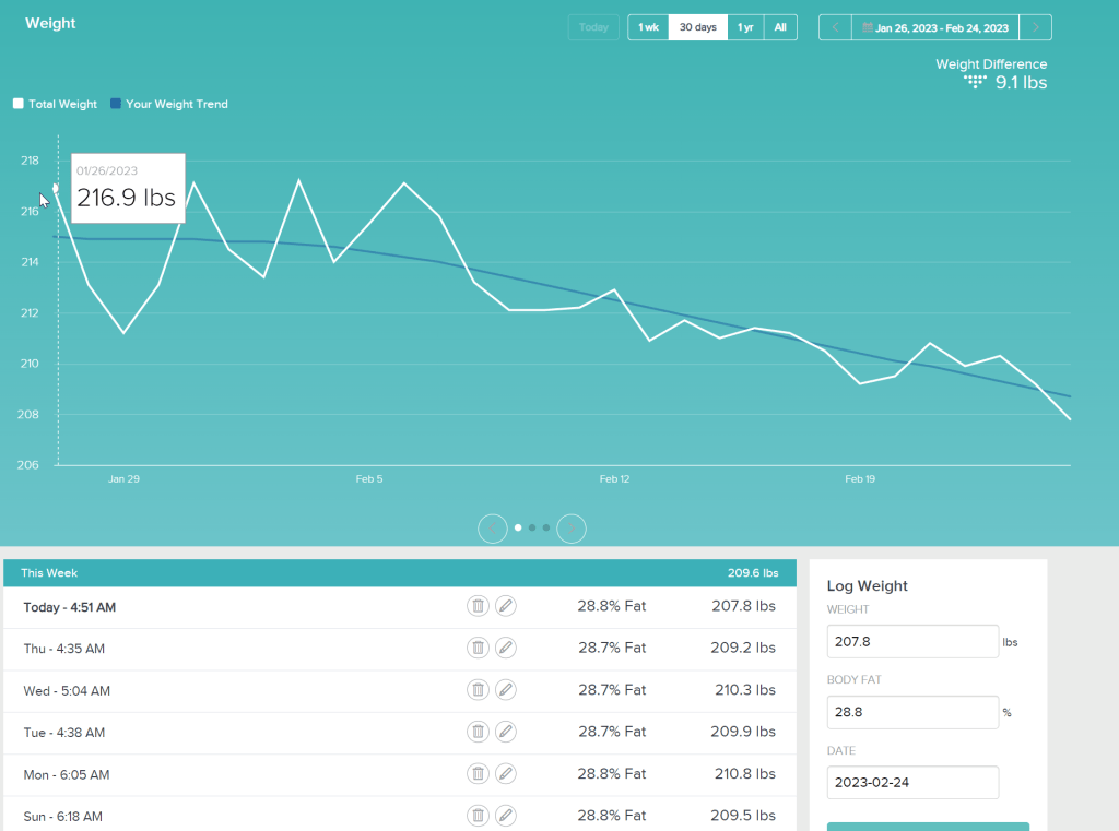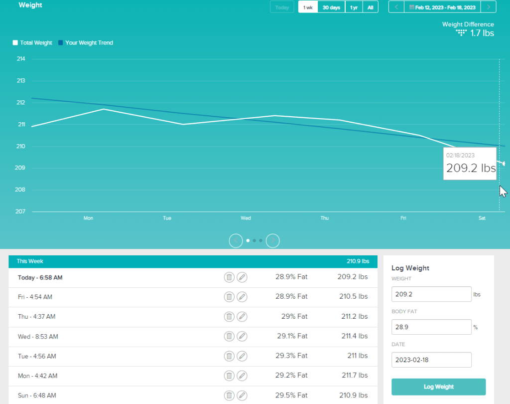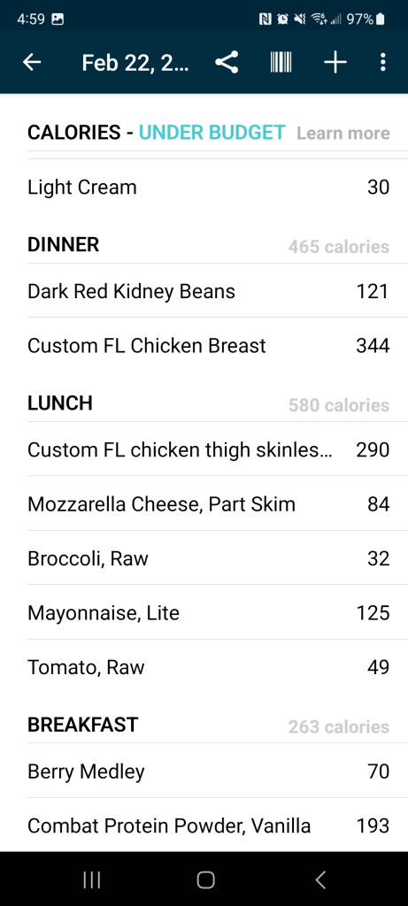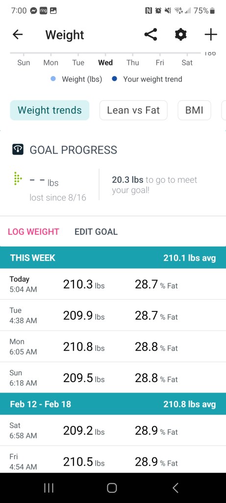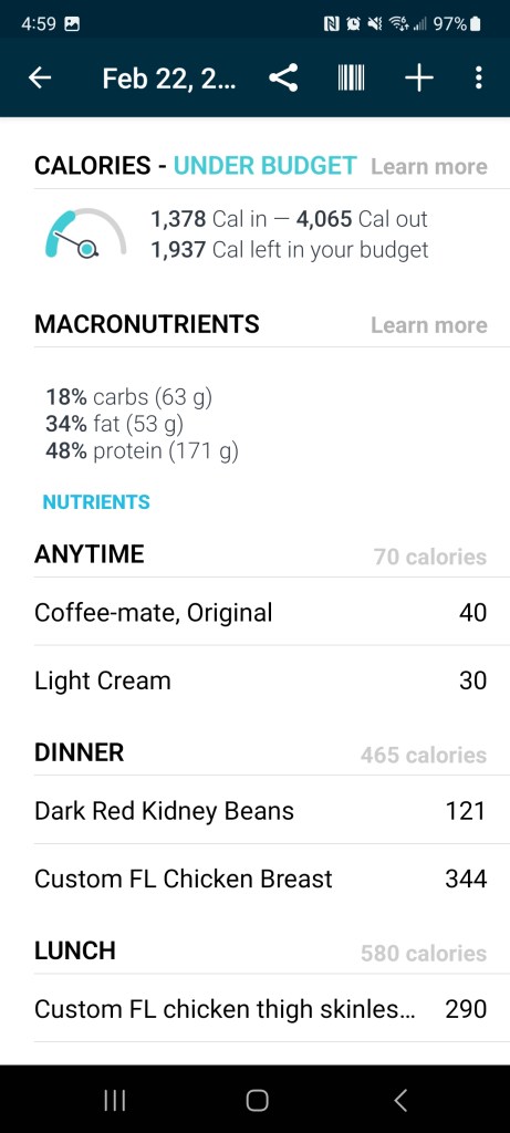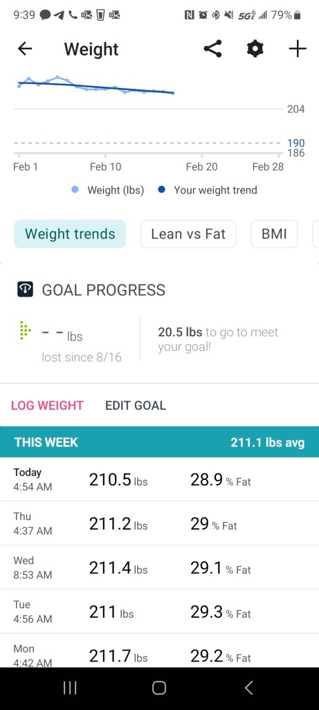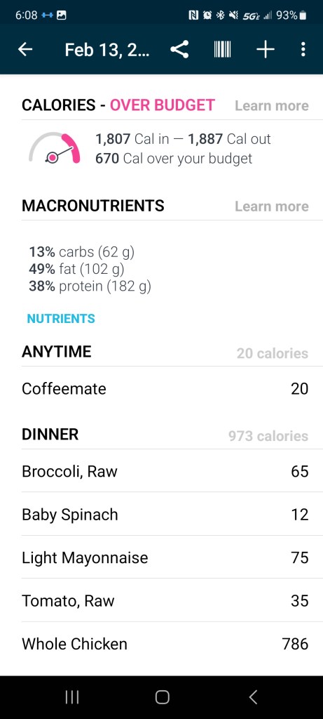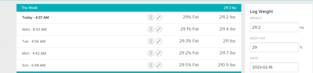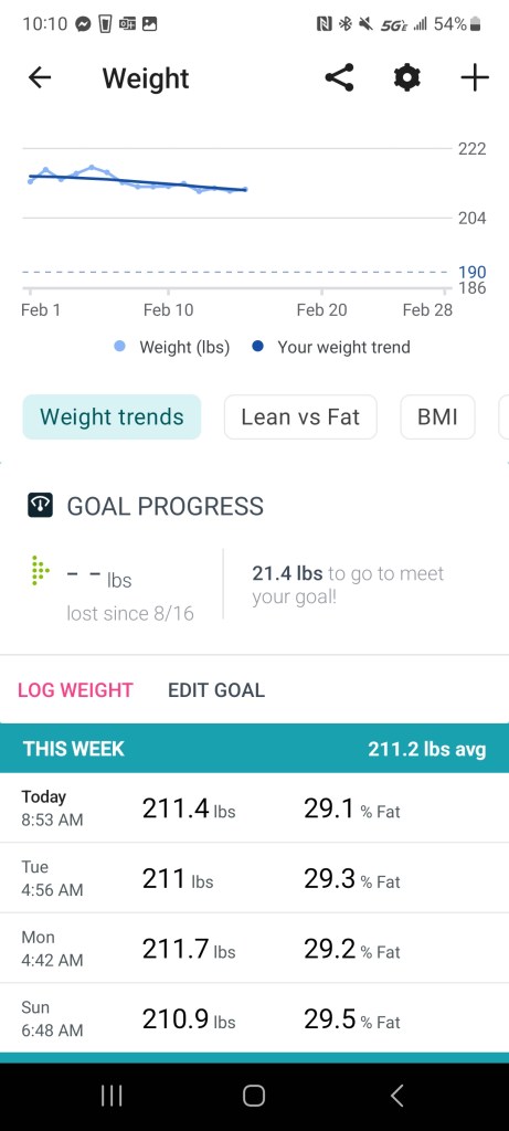 I’m getting there, even if yesterday was a little bit of an off day with going out to dinner for V-Day with my partner. I’m thankful that they were supportive of my diet goals and we both went with salads (though I did have to push back on the burger temptation). It means a lot to have a partner that actively supports your fitness goals rather than sabotage them (intentional or not). I get everyone is not ready to go on that journey but still, it makes it more difficult than it needs to be when they leave out snacky foods which erodes willpower over time. Don’t get me started on the health at any size ideology (positive vibe intentions won’t help failing joints due to supporting more weight than they can handle) Anyhow, on to the stats. This time I took a manual picture at my partner’s place. I also did the aria when I got back home but it is higher due to eating a breakfast English muffin with a little butter and coffee with half and half.