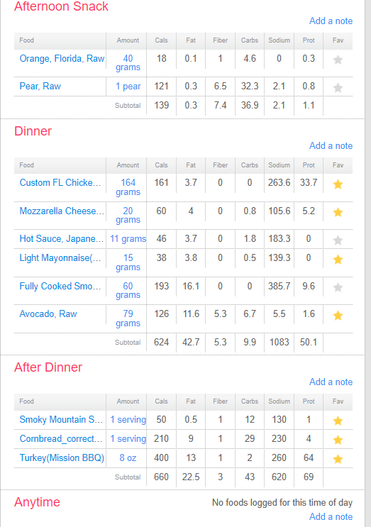 Finally broke 210 today. The diet was a little strange yesterday but mostly good. Going strictly by calorie count I was over, but I think the TEF of some of my foods was enough to overcome that. I also seem to have good success with avocados, even though my macro and calorie intake goal would want me to steer away from them. I also eat out for social reasons, even though I had just recently had my dinner. I went to mission bbq and chose to only have the turkey. I got a strange look from the cashier.