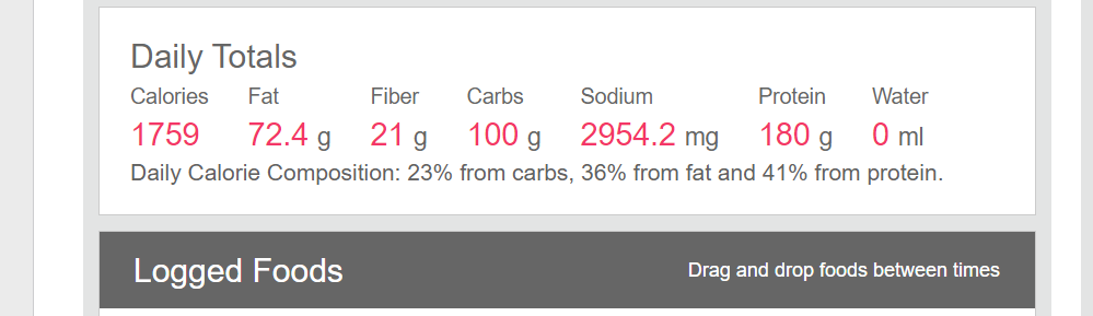 Something I’ve had a challenge with is how low my calories seem when I feel like I’m on point with my diet. I don’t feel like I’m starving at all. Dieticians, nutritionists, and trainers would take one look at my Fitbit log and blow a gasket probably though. I weigh what I eat so you would think it would be accurate…but I suppose all that depends on the label information being accurate, which I’m aware there is a pretty large margin of error. Perhaps it’d be better if there was a way (heh) to just track the overall weight of foods i put in my body rather than just going by the nutrition labels. I seem to be feeling fine at 1400 cals. Though to be fair, I’ve still got a good amount of fat to use. When I get leaner and have less fat to use and want to focus on muscle again that could be an issue.