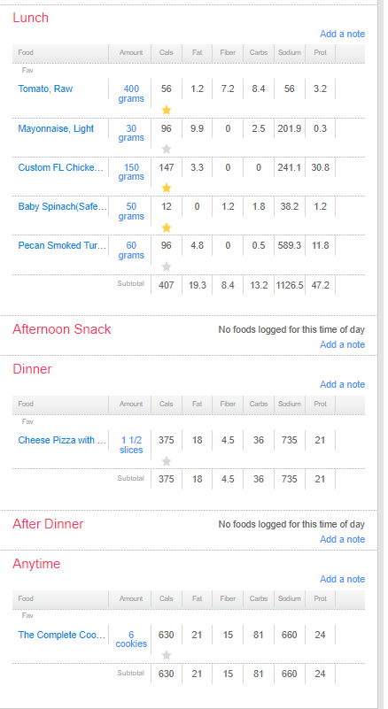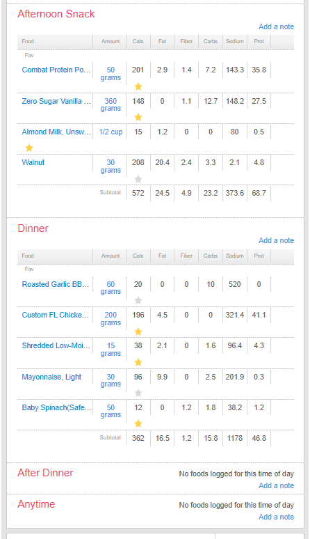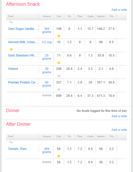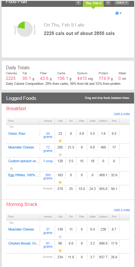 Diet went well yesterday. There are complications with my gym billing (CC expiration change) and they’re being ridiculously annoying when it comes to updating my billing info. Without that fixed I can’t register for bootcamp classes. I just walked in and did a strength training session instead (push/pull), which doesn’t burn as many straight calories (though of course it is beneficial in many other ways). I did get in a 20 minute walk in the afternoon as well…would have liked a little longer but the day just felt so busy and even that walk got delayed until like 3pm. Oh and I discovered our dishwasher is down (motor maybe?) so that’s more time spent and more stress on another thing to need to pay for. Anyhow, stats for yesterday: